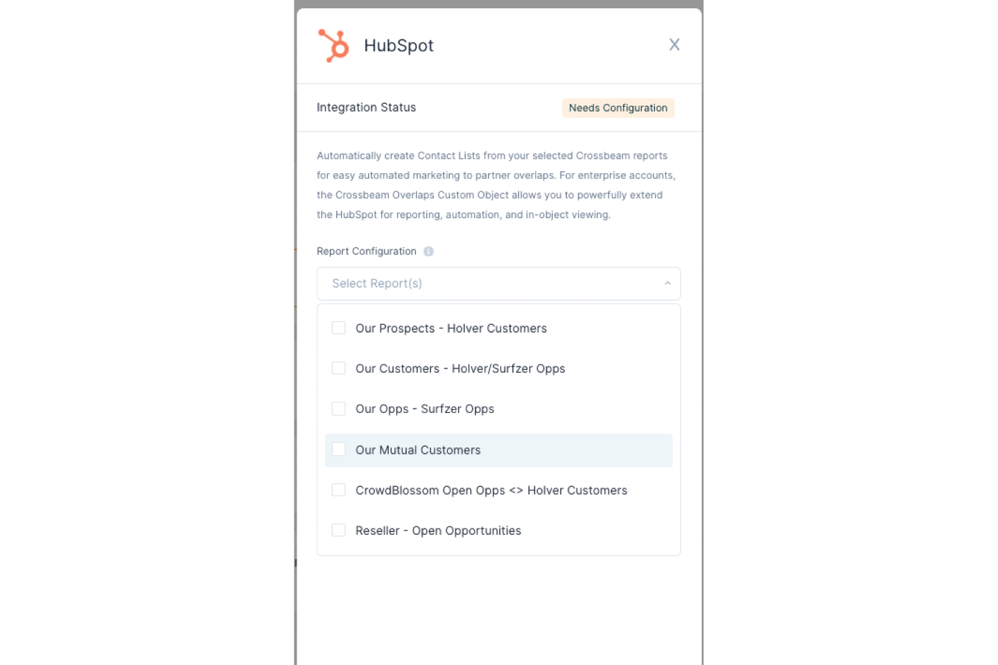 4. Once you've connected the systems, select your Crossbeam reports you'd like to use as the foundation for list creation in HubSpot.