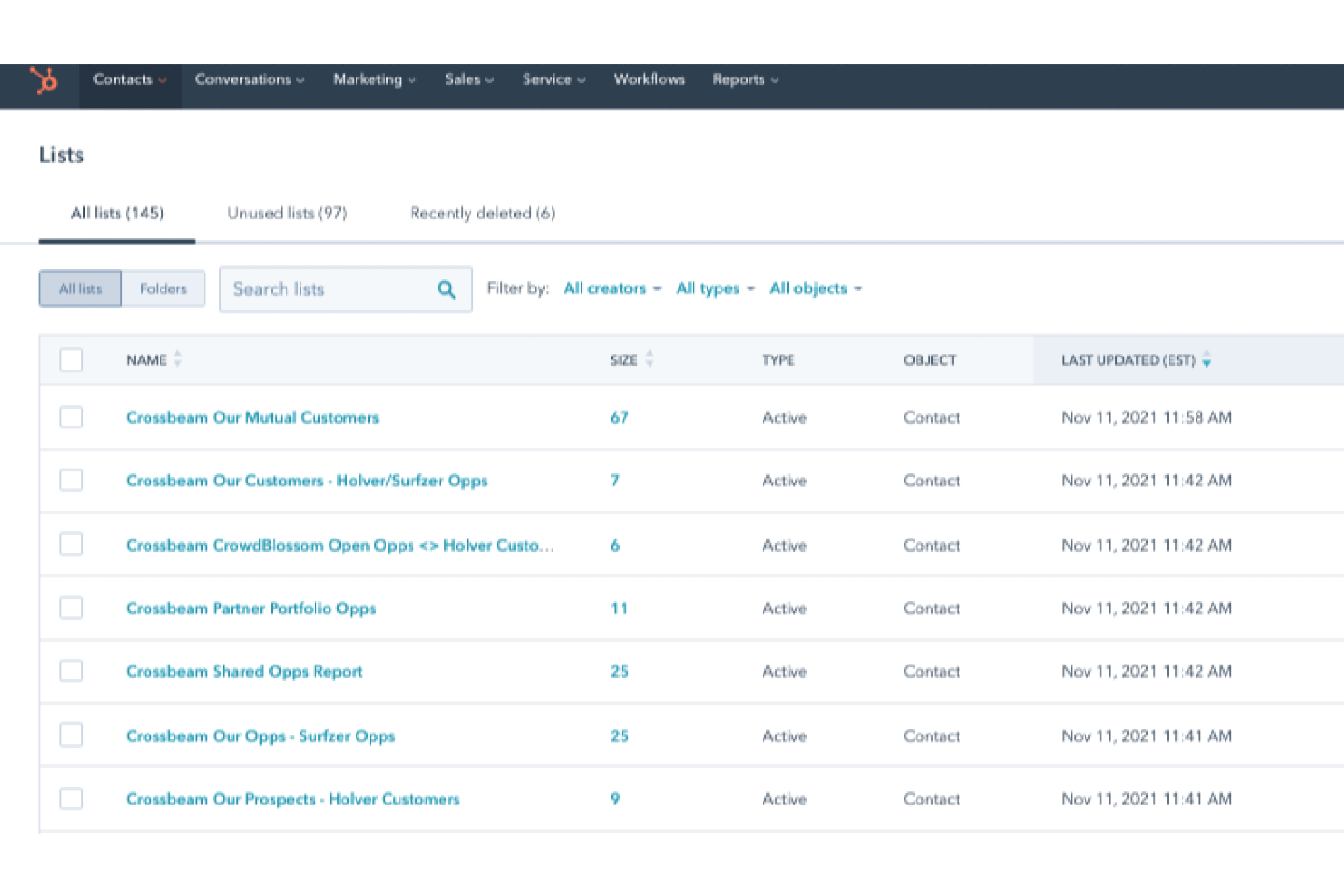 5. Upon selecting your reports, new overlaps and associated overlap data will automatically push into HubSpot and will be saved as corresponding lists. Contact lists will appear in HubSpot with the same naming convention as your reports in Crossbeam.