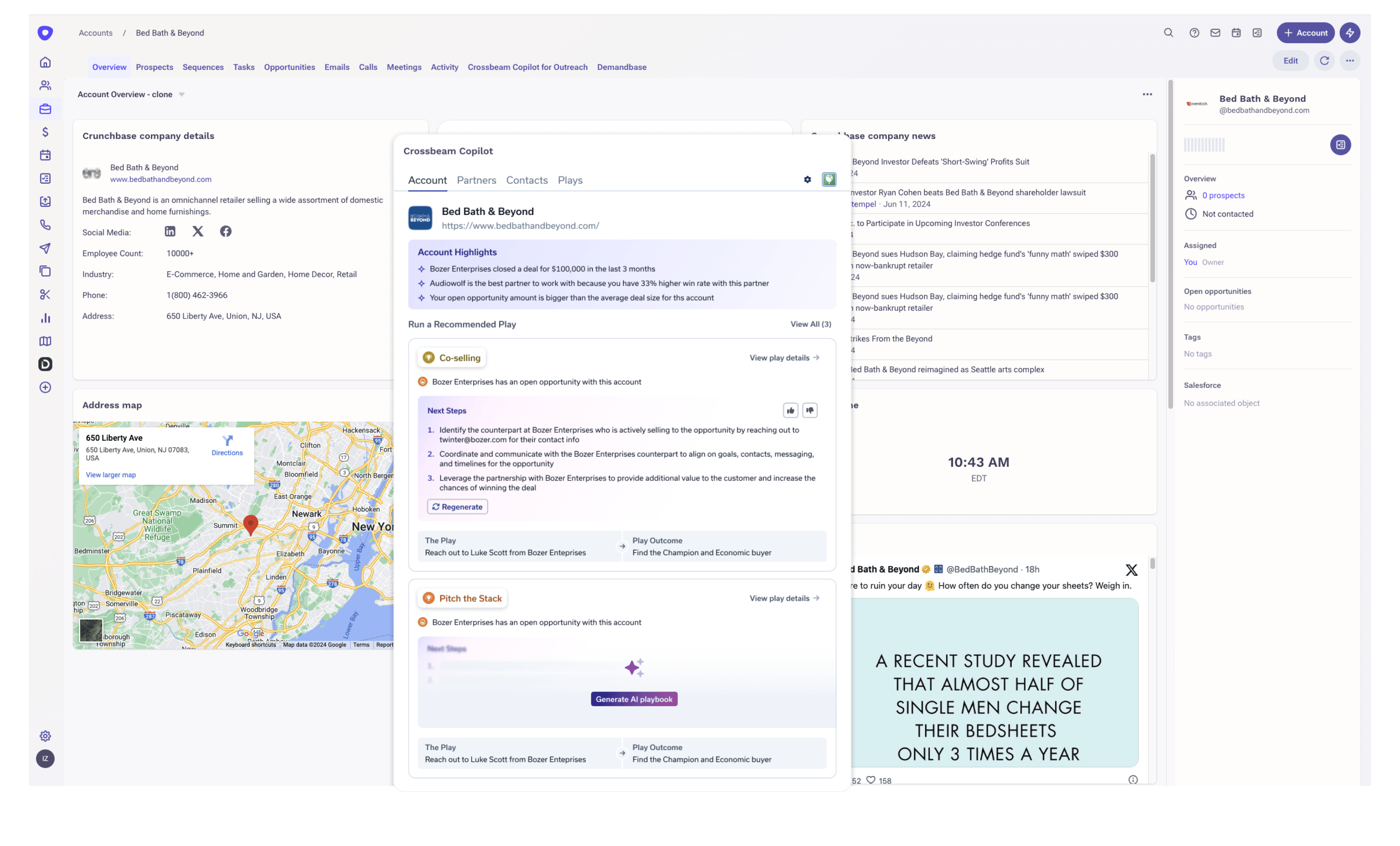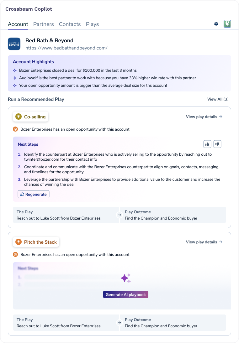 - Partner overlaps: Ecosystem Intelligence signals — like win rates and average deal size — to quickly identify the best partners for a warm intro or keep stalled deals moving