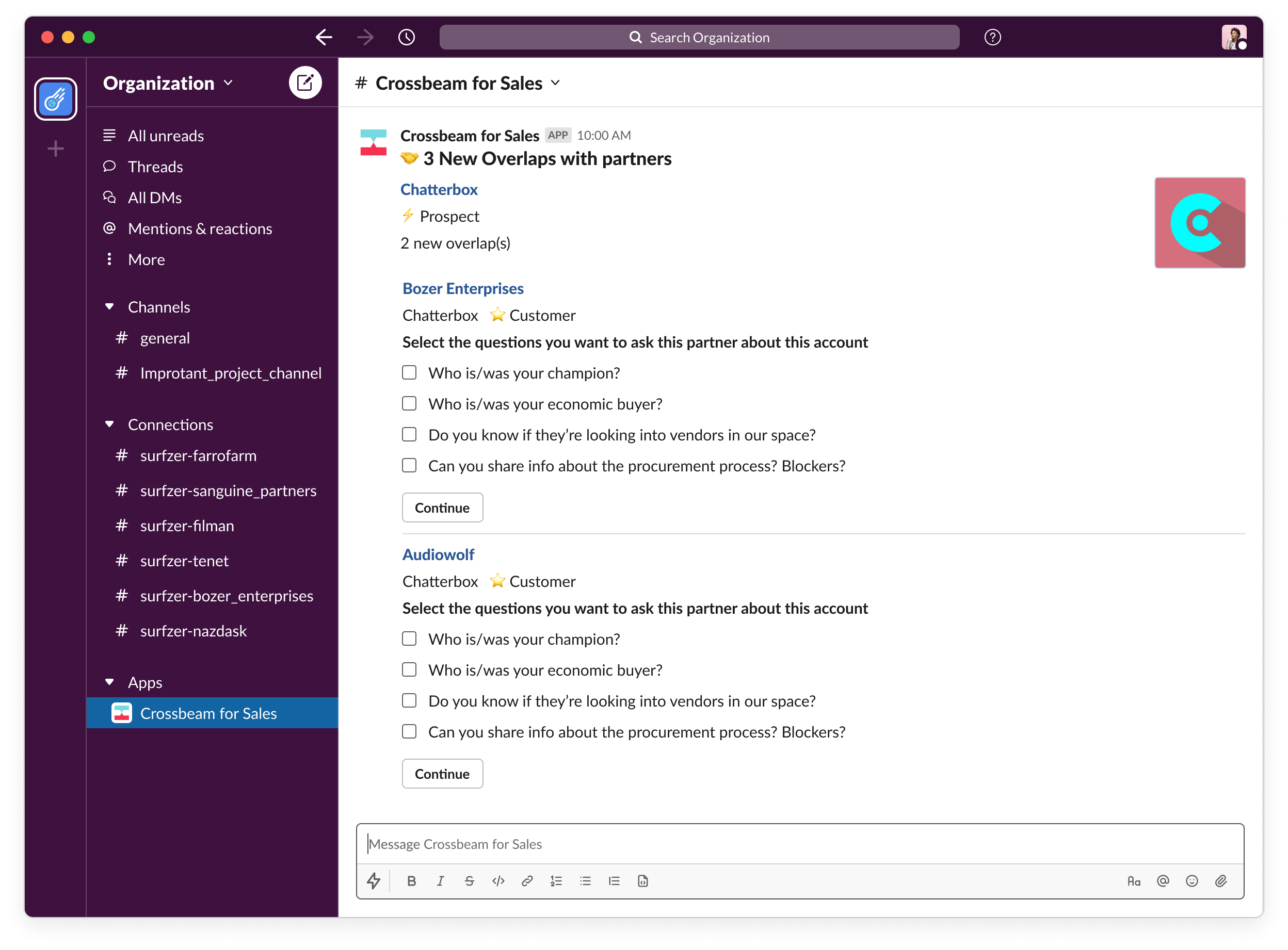 - Receive notifications on actions happening in Crossbeam for Sales directly in Slack