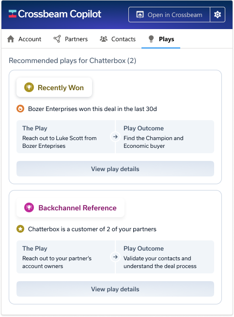 - Plays: Make every move count. Get actionable plays curated with the next best steps you can take to ensure your opportunities are marked as closed/won.